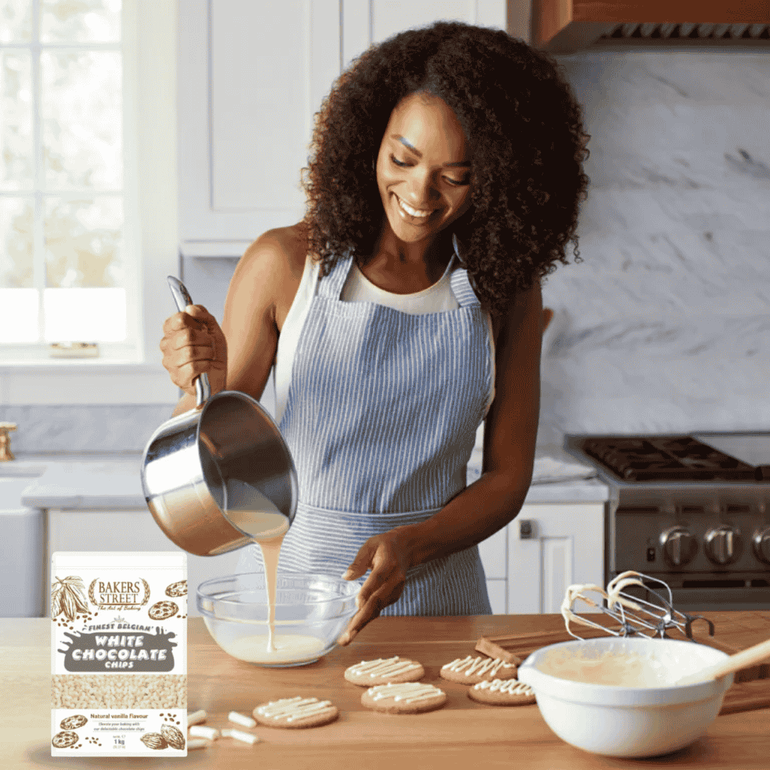 At Bakers Street, we know that quality ingredients make all the difference. Our White Chocolate Chips are specially crafted for bakers who demand excellence. Whether you’re baking cookies, muffins, brownies, or decorating cakes, these smooth, creamy white chocolate chips deliver a rich flavour and professional result every time.