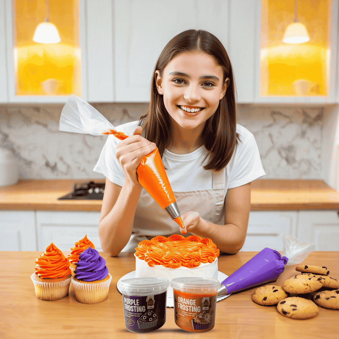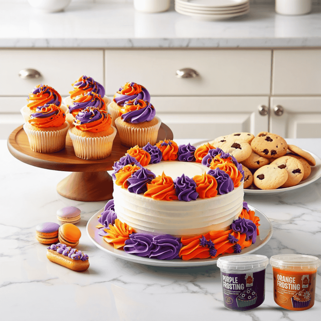 The bold orange frosting adds warmth, energy, and a festive feel to cakes and cookies. On the other hand, the striking purple frosting brings a touch of elegance, making it perfect for themed celebrations, seasonal events, or creative bakes. Combined, these two shades give you endless possibilities to create stunning designs that stand out.