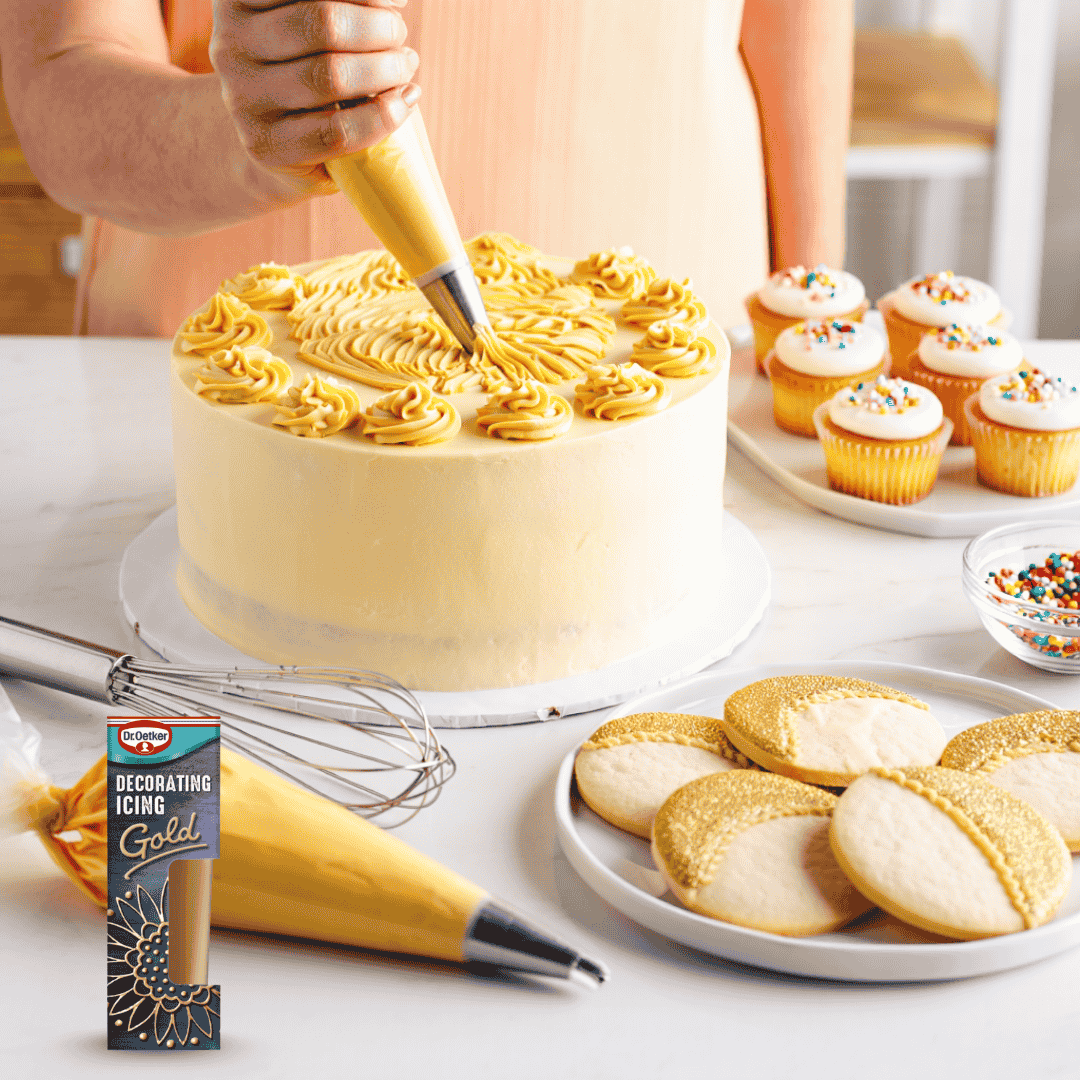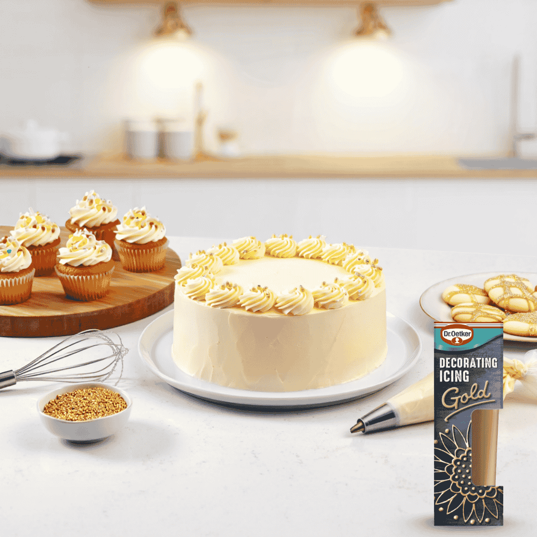 Whether you’re designing a golden drip cake or adding sparkle to cookies, Dr. Oetker’s Gold Icing is your go-to choice. Elevate your decorations with ease and flair perfect for bakers who love a little extra shine.