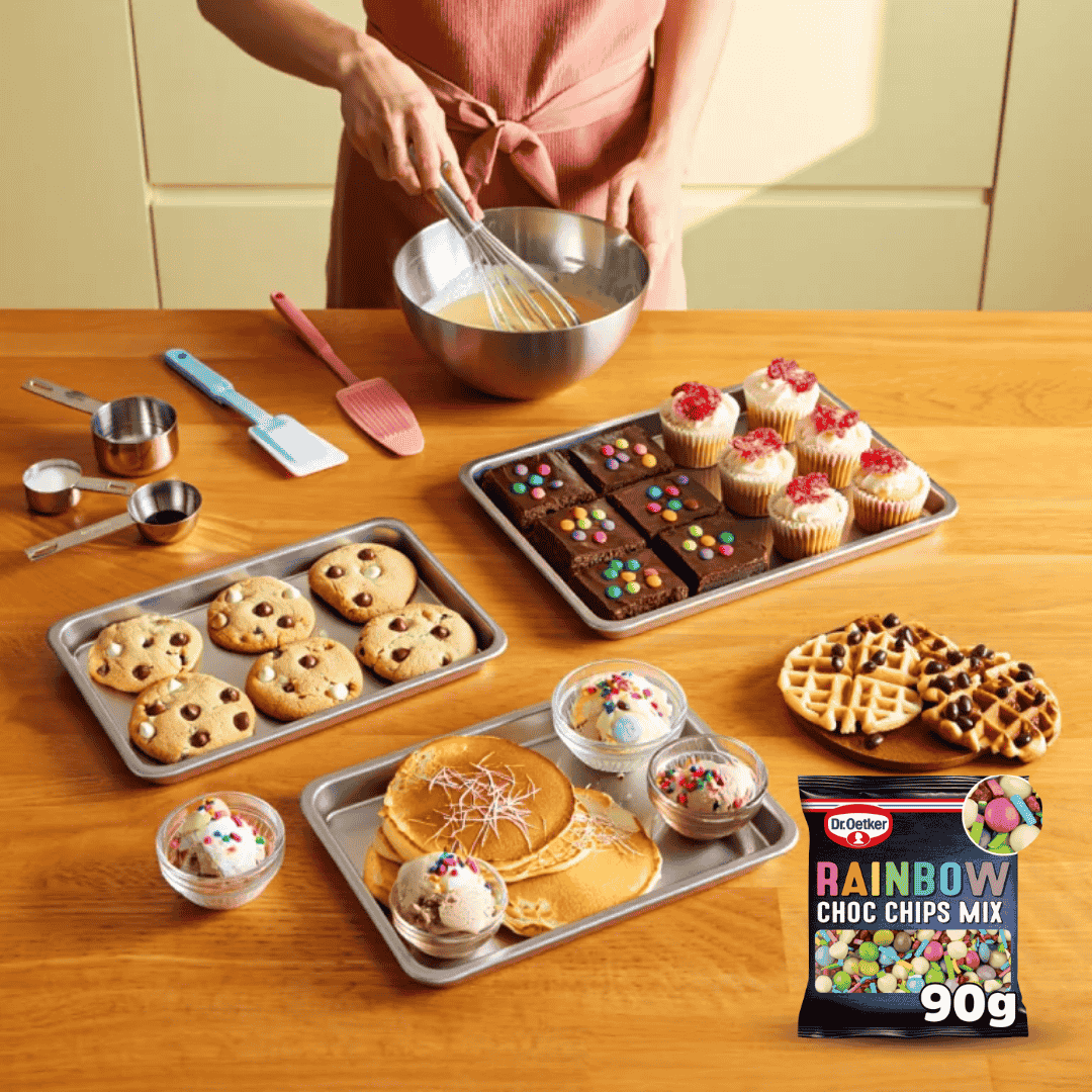 Order your Dr. Oetker Rainbow Chocolate Chips Mix 90g today from Bakers Street, and let your creativity shine with every colourful chip!