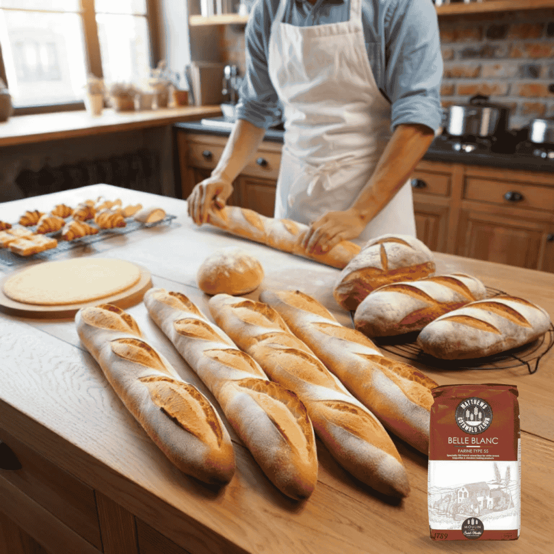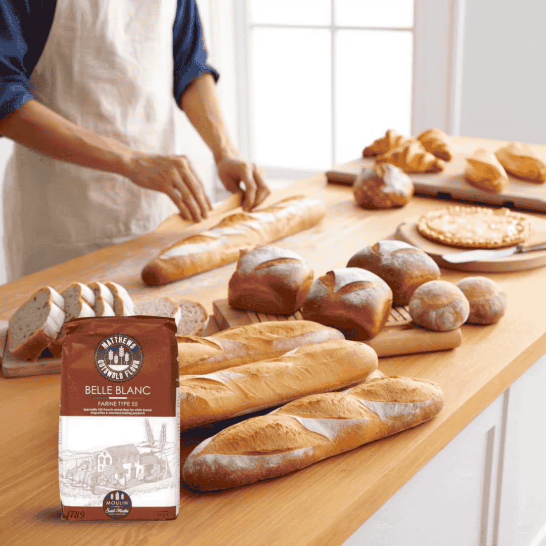 Matthews Belle Blanc French T55 Flour is renowned for its fine texture and well-balanced protein content. It works wonderfully for creating a variety of French-style baked goods, such as baguettes, croissants, pizza dough, and artisan bread. Thanks to its 11% protein content, the flour provides a good balance of elasticity and extensibility in your dough.
