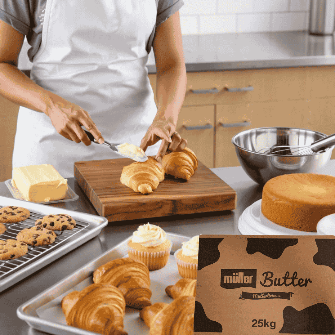 Muller Unsalted Butter is made from 100% pure cream with no added salt, giving bakers full control over the flavour and texture of their baked goods. Its smooth, creamy consistency and rich dairy flavour make it perfect for a wide range of applications from flaky croissants and buttery puff pastries to tender cakes, biscuits, and laminated doughs.