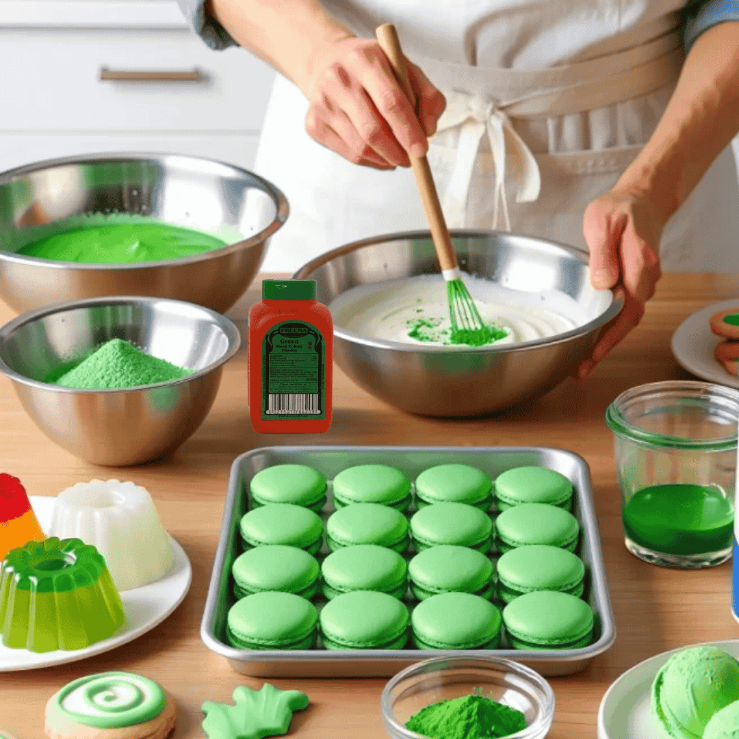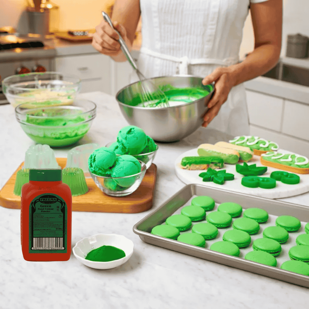 Add a small amount of Preema Green Food Colour Powder to your recipe and mix well.
